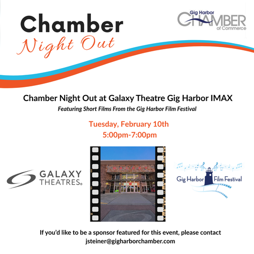 Join us for Chamber Night Out at Galaxy Theatre Gig Harbor IMAX featuring the Gig Harbor Film Festival on Tuesday, February 10th 2026. Beer, wine, and light snacks will be provided!