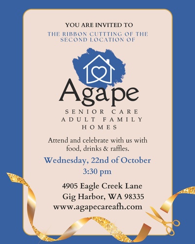 Name: Ribbon Cutting - Agape Adult Family HomesDate: October 22, 2025Time: 3:30 PM - 4:00 PM PDTWebsite: Gig Harbor Chamber of CommerceRegistration: Register Now