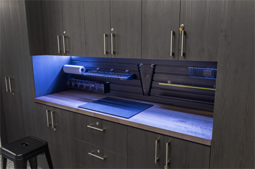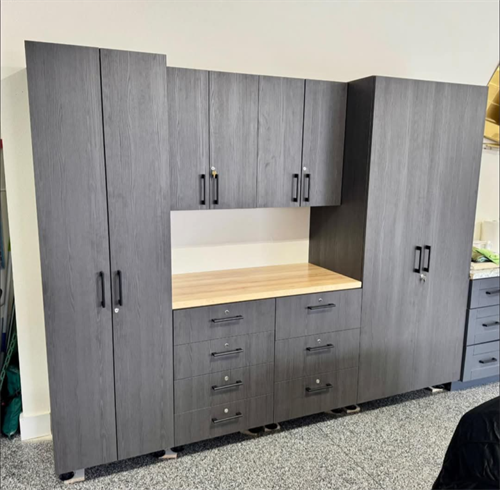 Garage epoxy floors, cabinets, and storage systems.